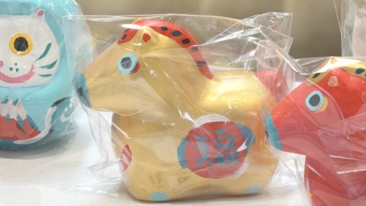 これは午の置物「福午」です。金色、赤、白、青、黄色などカラフルな色づかいが特徴で、全部で6種類あります。大きさは縦8センチ横10センチで、側面には「福」の字が入っています。