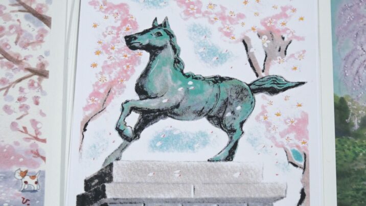 来年の干支、「午」などを上越市のイラストレーターひぐちキミヨさんが描いた年賀状などの展示販売展「ゆく年くる年」が、12月15日(月)まで直江津シッピングセンターエルマールで開催されています。