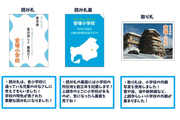 上越市の合併20周年を記念して統廃合された小学校を含む市内67校の特徴や歴史、子どもたちの思いを誰でも遊べる「かるた」にして未来に残そうとしています。
