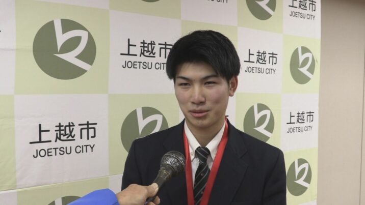 高校バレーの日本一を決める通称「春校バレー」に来月初めて出場する関根学園高校男子バレーボール部が、9日(火)に上越市役所を訪れ、小菅市長に決意を語りました。