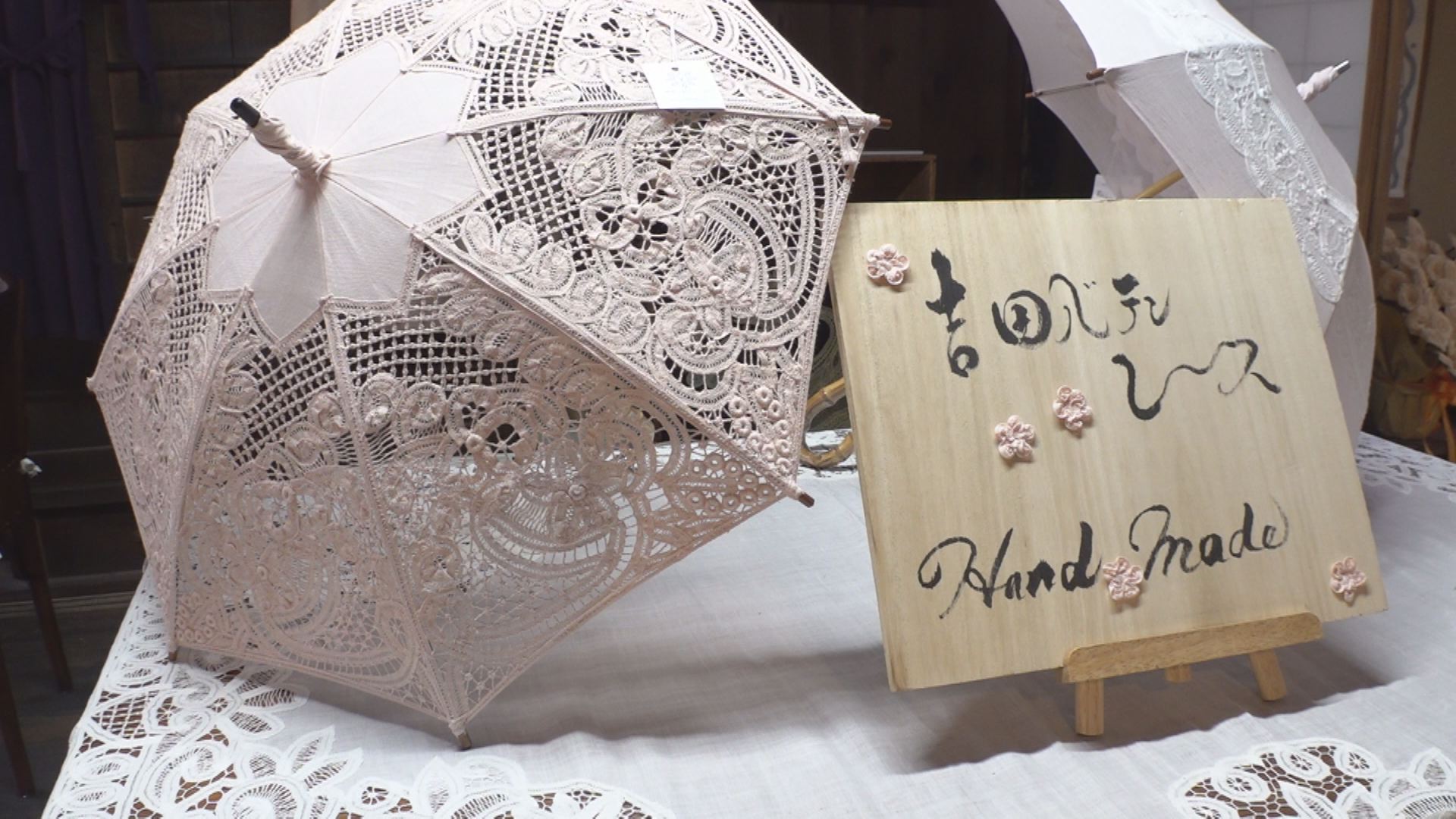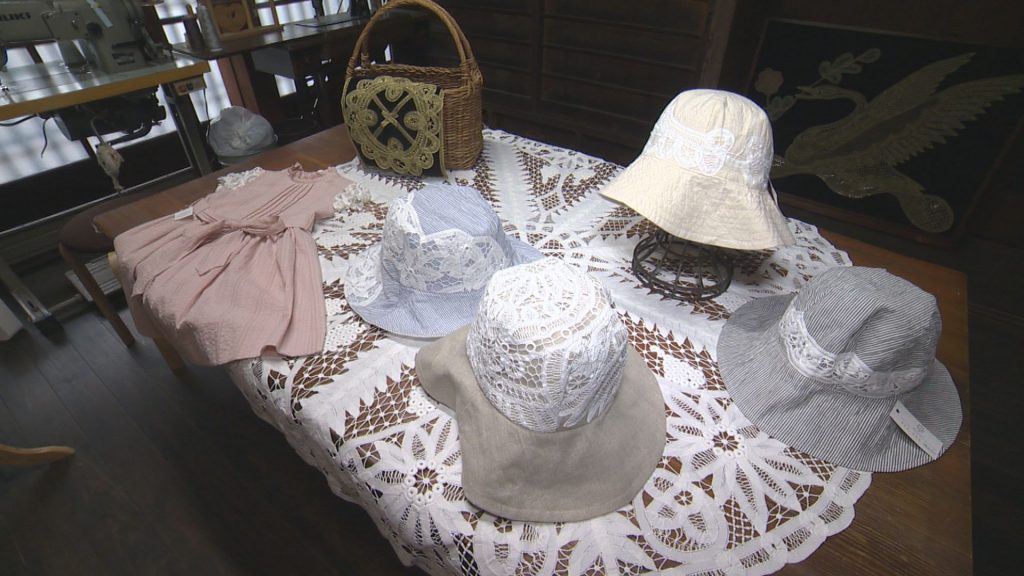 会場では吉田バテンレースの商品をはじめ、型紙や写真なども展示。日傘、洋服、襟、額装、テーブルクロス、のれん、アクセサリーなどの小物類などが並びます。そのほかにも、10年以上教室に通っている生徒の作品をはじめ、毎月行っている教室や上越市が主催しているバテンレース継承講座の皆さんの作品も展示されます。