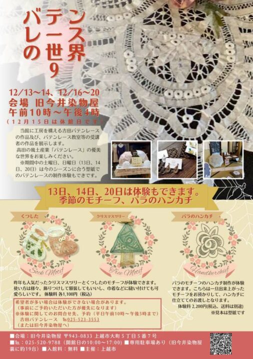 高田の風土産業「バテンレース」の作品の展示や制作体験が楽しめる作品展「バテンレースの世界9」が上越市大町5丁目の旧今井染物屋で、12月13日(土)から開催されます。
