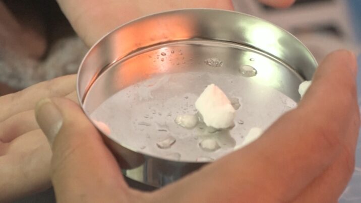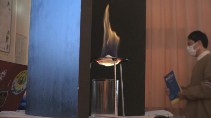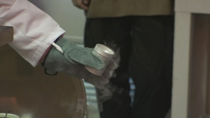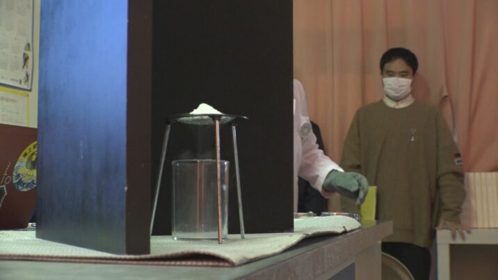 青山准教授は実際にマイナス189℃の液体窒素の中に入っているメタンハイドレートを取り出し、火を近づけました。