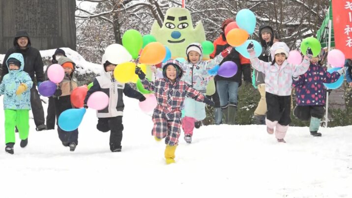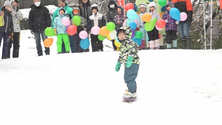 神事の後、地元の妙高高原こども園の園児が妙高市のご当地キャラクター「ミョーコーさん」と一緒に神社の坂でスキーやスノーボードで滑ったり風船を持って走ったりして雪の感触を楽しんでいました。