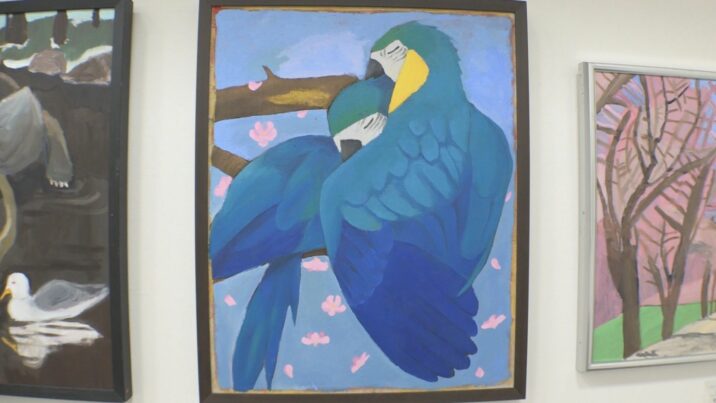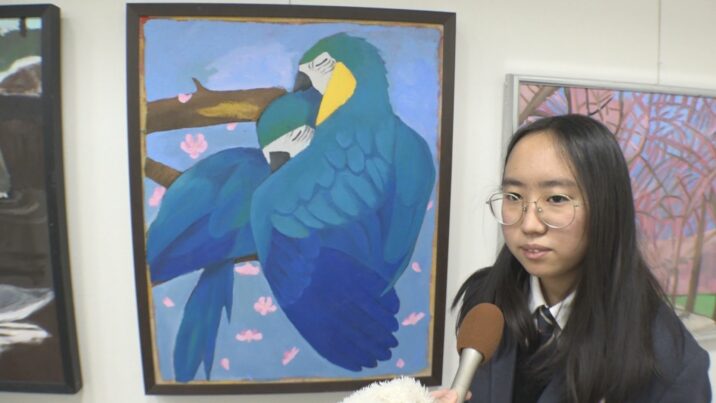 関根学園高校1年生、後藤夢菜さんの作品「2羽だけの世界」では、動物園で撮影した写真を基に、2羽のインコが体を寄せ合う姿を描きました。羽の色のグラデーションを工夫したということです。
