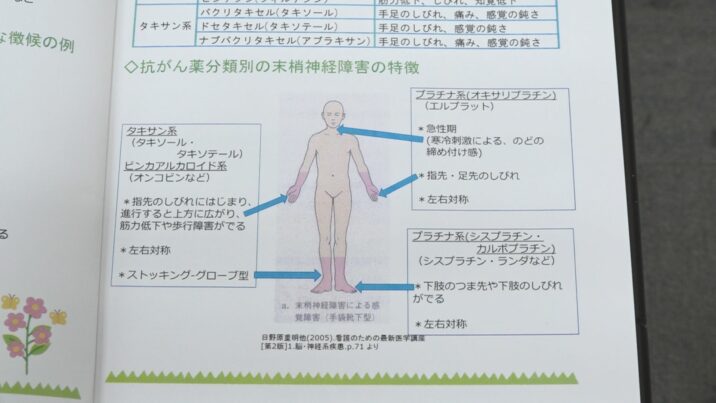 神田学長は、抗がん剤の副作用による症状を患者が自ら把握する尺度を、日本で初めて開発しました。神田学長によりますと、抗がん剤の副作用による手足のしびれなどの末梢神経障害は、症状を抑える薬がないのが現状です。この影響で、指で紙をめくったり、ボタンをかけたり外したりすることがうまくできないなど、日常生活に支障をきたすことがあります。その上、心理的なショックや、病気に対して周りから理解してもらえないなど、さまざまな点から生活の質が低下することがわかっています。