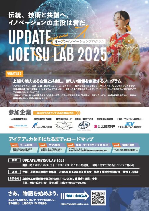 地元企業とチームを組んで、アイデアやプランを事業化するオープンイノベーションプログラム「アップデート上越ラボ2025」が12月20日(土)午後1時から上越市本町5丁目のあすとぴあ高田5階のミュゼ雪小町で開催されます。現在、観覧者を募集しています。