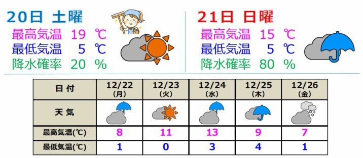 ・最高気温は季節外れの19度予想。貴重な暖かさとなるので早めの大掃除もおすすめ