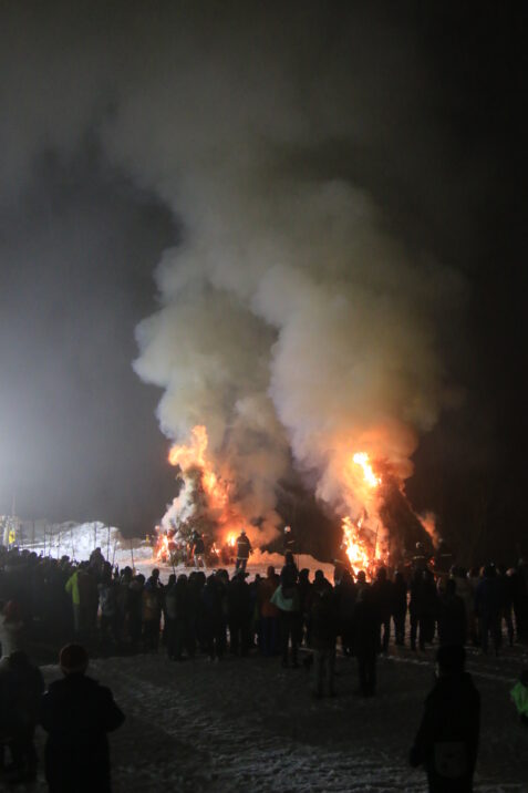 1年の五穀豊穣や無病息災を祈る小正月行事「どんど焼き」は、会場にかやで作られた高さ7メートルを超える2基のどんどが設置され、点火します。またフィナーレには、冬の夜空に大輪の花火が打ち上げられます。