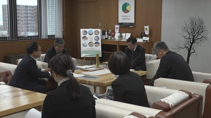 上越市津有地区にある築100年以上の古民家を改修したモデルハウスが、国際的なデザイン賞で最優秀賞を受賞しました。このほど改修工事を担当した、上越市の「山岸建工」など関係者が上越市役所を訪れ、小菅市長に報告しました。