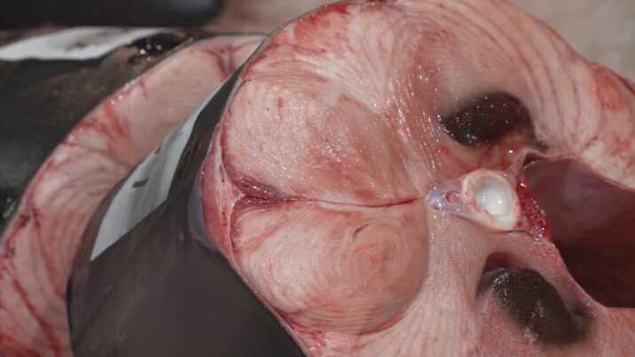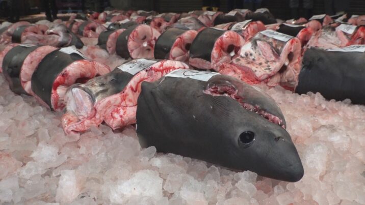 並んでいるのは、宮城県の気仙沼漁港で水揚げされたオスのモウカザメ20本です。