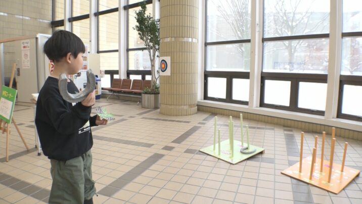 今年は牛乳パックでコマを作ったり、紙と毛糸で装飾品を作ったりするコーナーのほか、干支「うま」にちなんだフォトスポットや輪っかの代わりにてい鉄を投げる「てい鉄投げ」の体験コーナーも並びました。