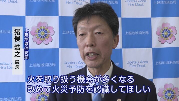 上越地域消防局の猪俣浩之局長は「火災・救急・救助、あらゆる災害に対して対応できるよう日々の訓練を重ねて備えたい。火災予防は消防だけの努力では達成できない。市民の協力があってこそ。火を取り扱う機会が多くなる。改めて火災予防を認識してほしい」と協力を呼びかけていました。