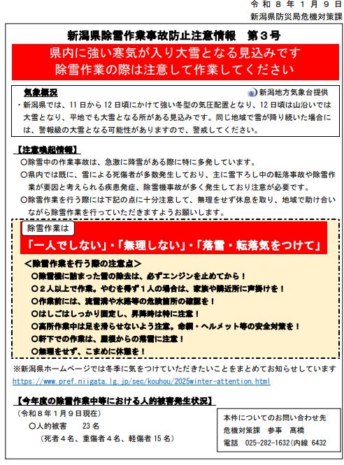 また、新潟県防災局危機対策課は11日(日)から県内に強い寒気が入って大雪になる見込みであることから、除雪作業は十分注意して行うよう呼びかけています。