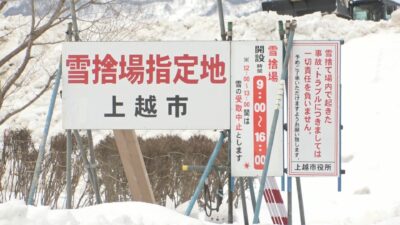 上越市では除雪作業が本格化したのに合わせて、市内の2か所に雪捨て場が開設されました。上越市中央の船見公園駐車場は今月9日から、戸野目古新田の上越総合運動公園は、これまでの上越大橋付近に替わって13日から開設されました。上越総合運動公園には朝から、次々とトラックが入り、雪を捨てていました。