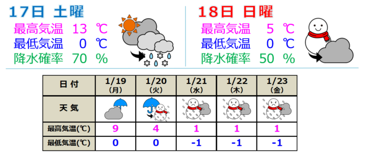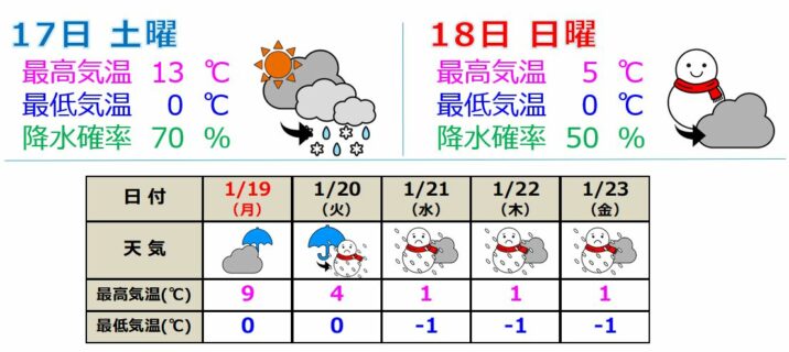 ・晴れのち雨から雪に変わり、昼頃の最高気温は13度まで上がる予想