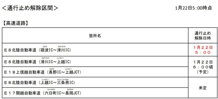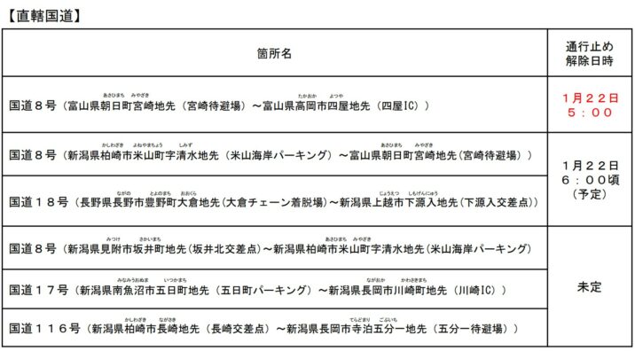 国道交通省北陸地方整備局とネクスコ東日本などは、21日(水)からの大雪に伴い、高速道路と国道で通行止めを実施していましたが、一部通行止めを解除しました。そのほかの区間も22日(木)午後6時以降、通行止めを解除する予定だということです。詳しくは下記をご覧ください。