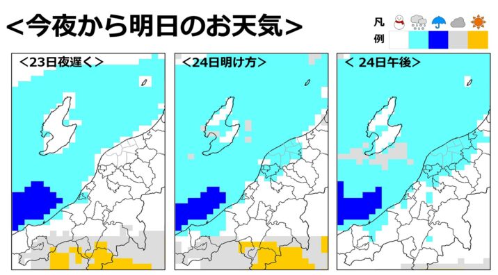 上の天気図をご覧いただきますと、今晩からあす24日(土)あけ方にかけて、妙高や津南など山間部の雪は小康状態が続きそうですが、24日午後になると再び全域で雪やみぞれがふりだしてくるでしょう。