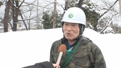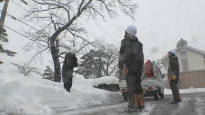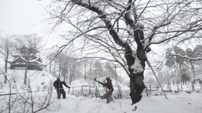 連日の大雪で、高田城址公園には雪が1メートルほど積もっています。およそ2か月後の高田城址公園観桜会に向け、サクラの手入れを専門で行なう「桜守」が、はしごに登ってサクラの不要な枝を切る剪定作業をしています。