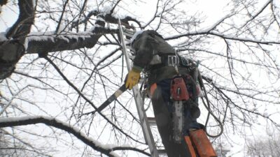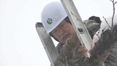 高さ5メートルほどのはしごに登り、枯れた枝を切り落としていきます。このあと切り口に殺菌剤を塗り、切った枝は、そりに乗せて運びます。