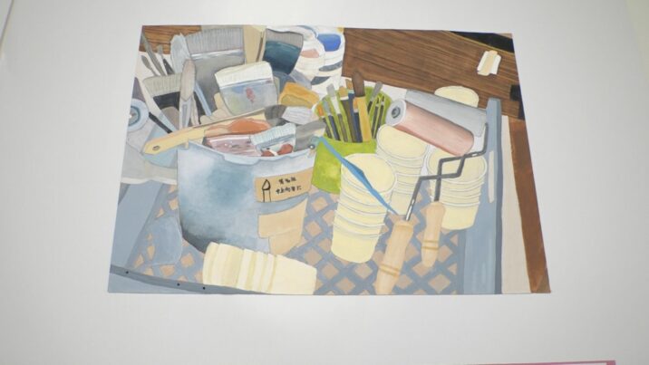 これは、最高賞の特賞に輝いた上越教育大学附属中学校1年生 大渕凜星さんの作品「筆と色」です。筆やハケの毛並みなど道具をよく観察して表現していることや、対象をしっかり見つめようとする姿勢が伝わってくると評価されました。