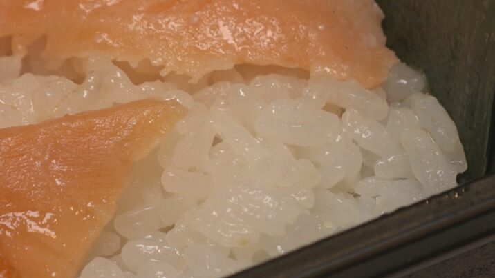 コメは食品安全や環境保全などの国際水準を満たす農林水産省の「GAP」認証を受けています。サーモンは生徒が仕入れ、一つひとつ手作業で切り身にしています。味付けも生徒自身が行い、魚沼地区の乳酸菌ウオヌマ株を加えてまろやかな酸味を引き出しています。