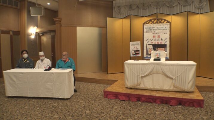 幅広い世代に食べてもらおうと、包装にはコメとサカナを持つ女の子のイラストを描きポップに仕上げました。完成に合わせ、ホテルハイマートで30日(金)会見が開かれました。