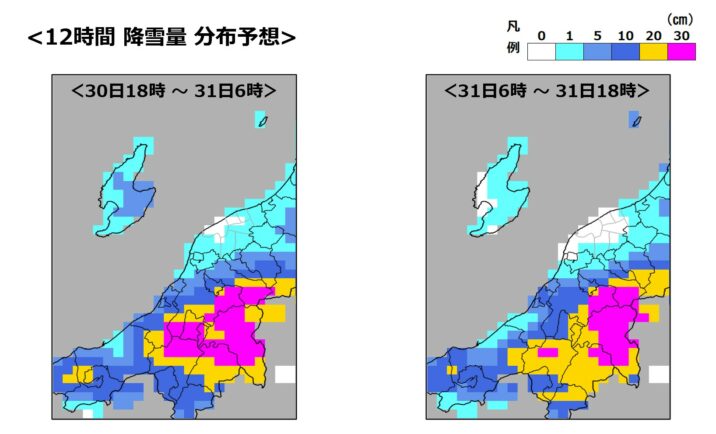ご覧の上図は、コンピュータで計算した今夜とあす31日(土)の12時間降雪量予想です。ピンクや黄色で示された降雪の中心は、十日町から魚沼方面になる予想です。上越地方では東部の安塚方面でやや多い傾向ですが、ドカ雪の可能性は低そうです。