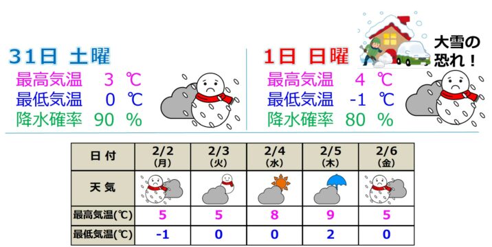 31日(土)昼過ぎにかけて断続的に雪 2日(月)ごろまで大雪に警戒を