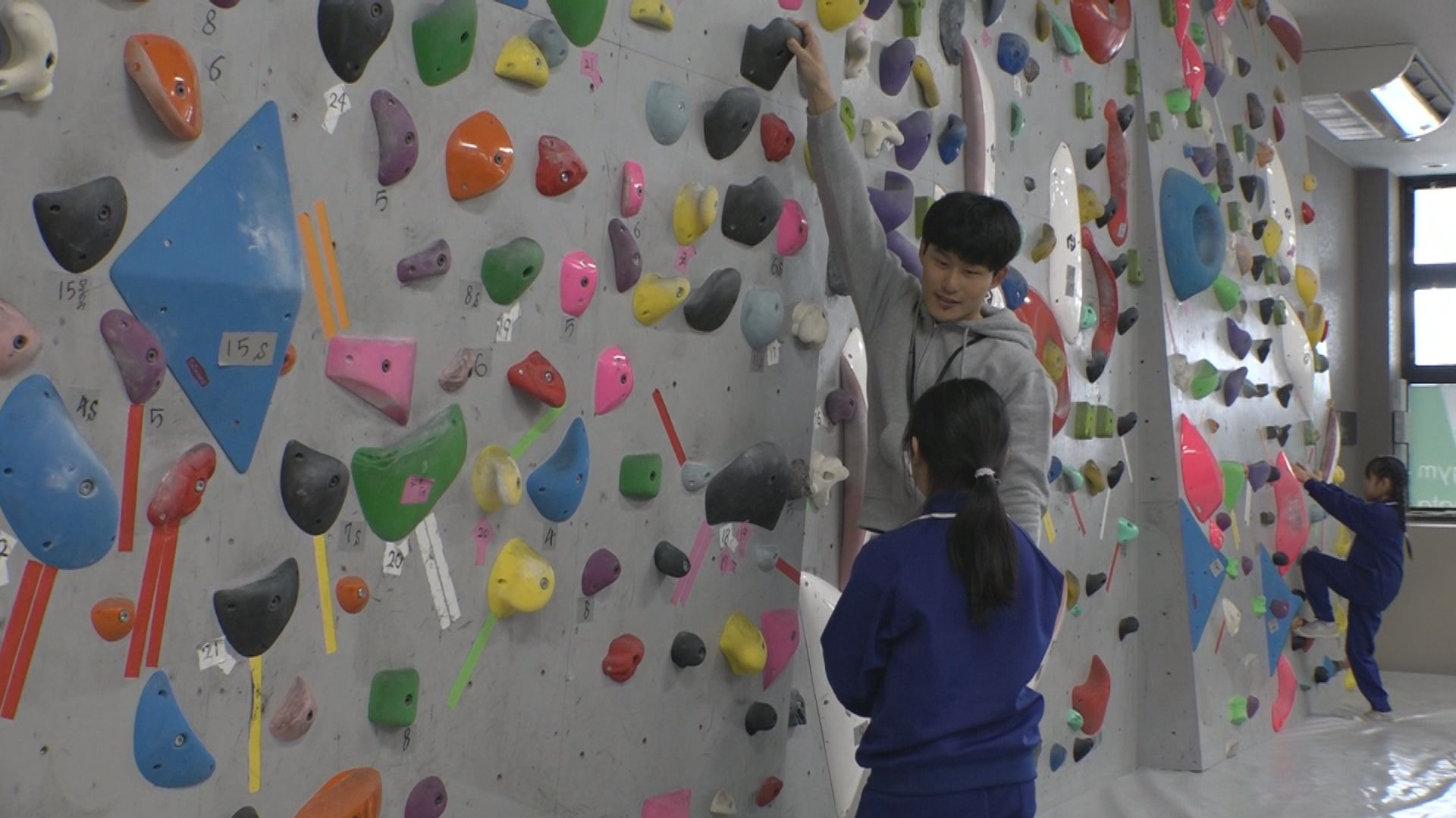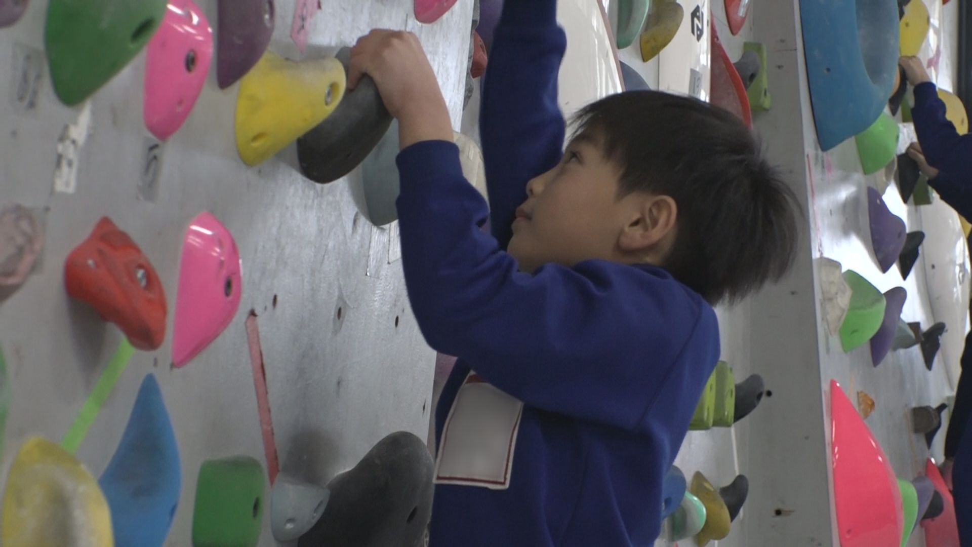スポーツクライミングは壁に取り付けられた「ホールド」と呼ばれる突起物に手や足をかけ、壁を登る難易度やスピードを競います。オリンピックの競技になったことでも知られていて、児童は競技の1つ「ボルダー」に挑戦しました。