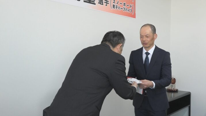 一方、スノーボード男子ハーフパイプに出場する山田琉聖選手には、市民が書いたメッセージが、山田選手が通う妙高市原通にある国際スノーボード&スケートボード専門学校の植木潤副校長に贈られました。