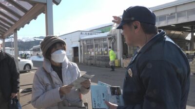 1月30日(金)に上越市板倉区山越の市道で男性が除雪車と接触して死亡した事故を受けて、事故現場付近のスーパーで5日(木)に上越警察署などが買い物客に交通安全を呼びかけました。