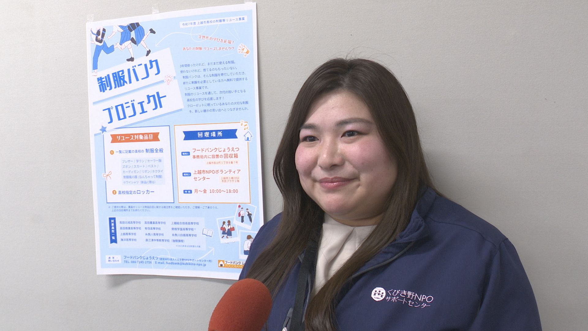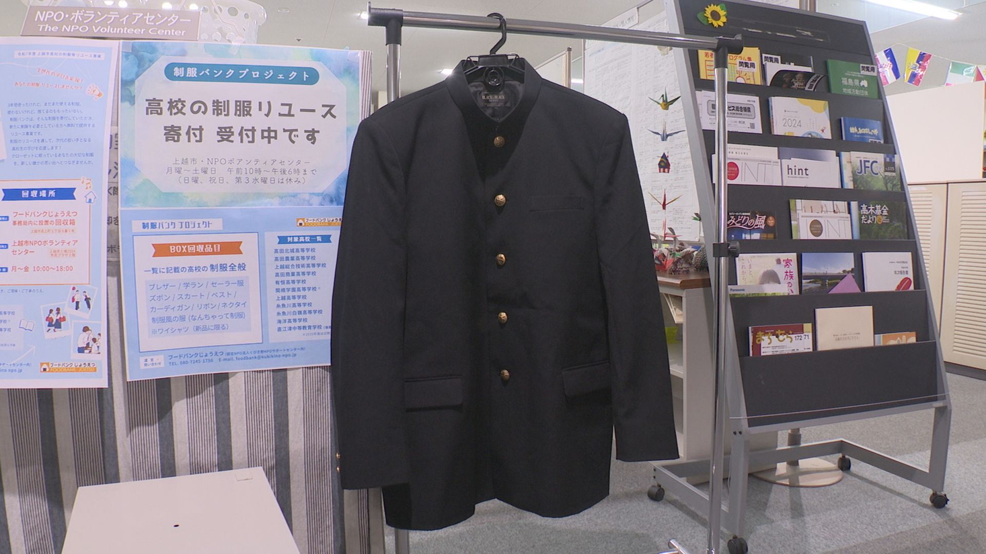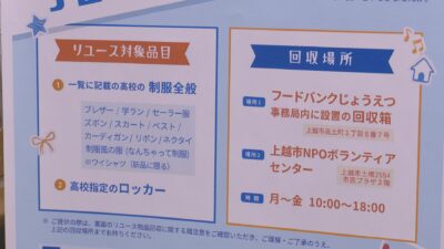 このプロジェクトは子育て世帯の負担を軽減しようと、くびき野NPOサポートセンターが運営する「フードバンクじょうえつ」が始めた取り組みです。着なくなった高校の制服を寄付してもらい、新た必要としている人に無料で提供します。現在団体では制服の寄付を呼びかけています。