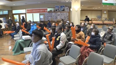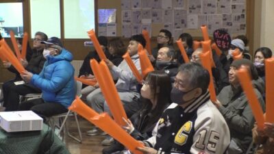 パブリックビューイングは妙高市原通にある冨田選手の母校、国際スノーボード&スケートボード専門学校で行われ、城戸市長をはじめ在校生や地域の住民など30人ほどが集まり熱い声援を送りました。