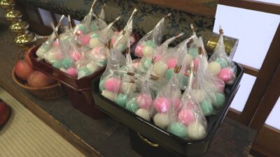 お参りをしたあと、団子がまかれました。これは、市内の菓子店が作ったもので、ひとつの袋に直径2センチほどの団子が3つずつ入っています。