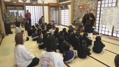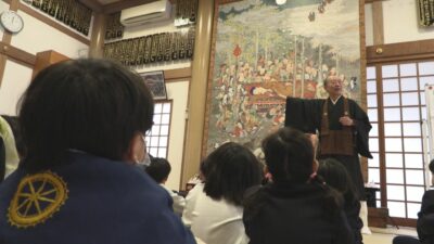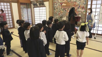 はじめに大厳寺の佐藤信明住職が縦3メートルほどある「涅槃図」を使って園児に「団子まき」の由来を紹介しました。「涅槃図」には、葬式の始まりとされる釈迦が亡くなった場面が描かれています。佐藤住職は釈迦を火葬したあと、弟子が遺灰で団子を作り形見にしたのをきっかけに、1年間の元気を願って団子をまくようになったと話しました。