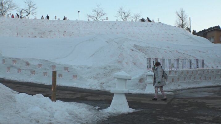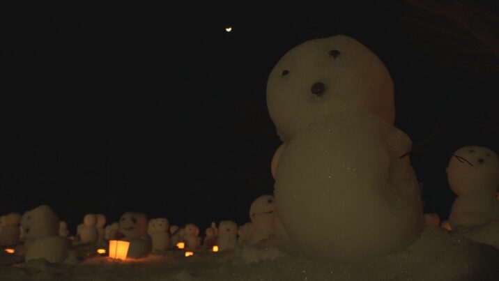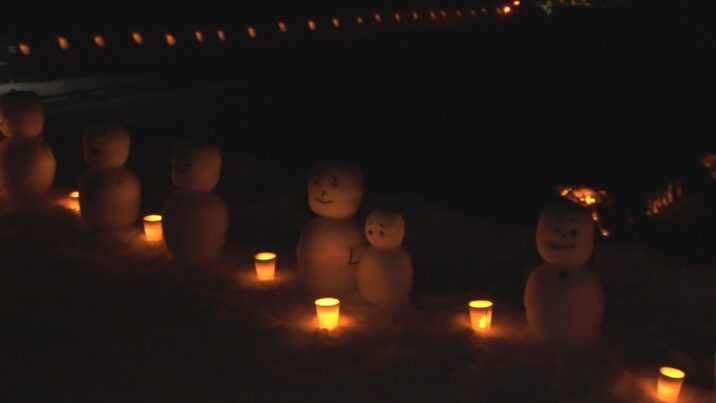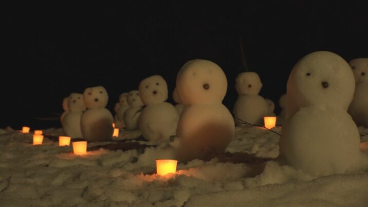 雪灯籠およそ1000個と、高さ30センチほどの雪だるま300個ほどが訪れる人を歓迎しました。全て地域の人やボランティアによる手づくりです。