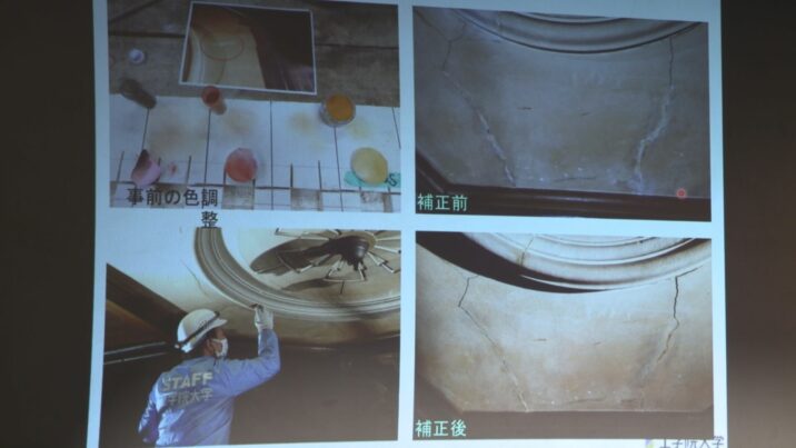 天上の飾りは直径2.5メートルあり、漆喰で出来ていて、いくつものひびが入っています。また、天井を吊って支える部分が外れ、一部が5センチほど下がっています。田村教授によりますと天井の修繕はこれまで1度も行われていないということです。これらを修繕するためひびの近くに穴を70か所あけ、そこへ漆喰の粉を混ぜた樹脂を流し込むなどの工事が行われました。
