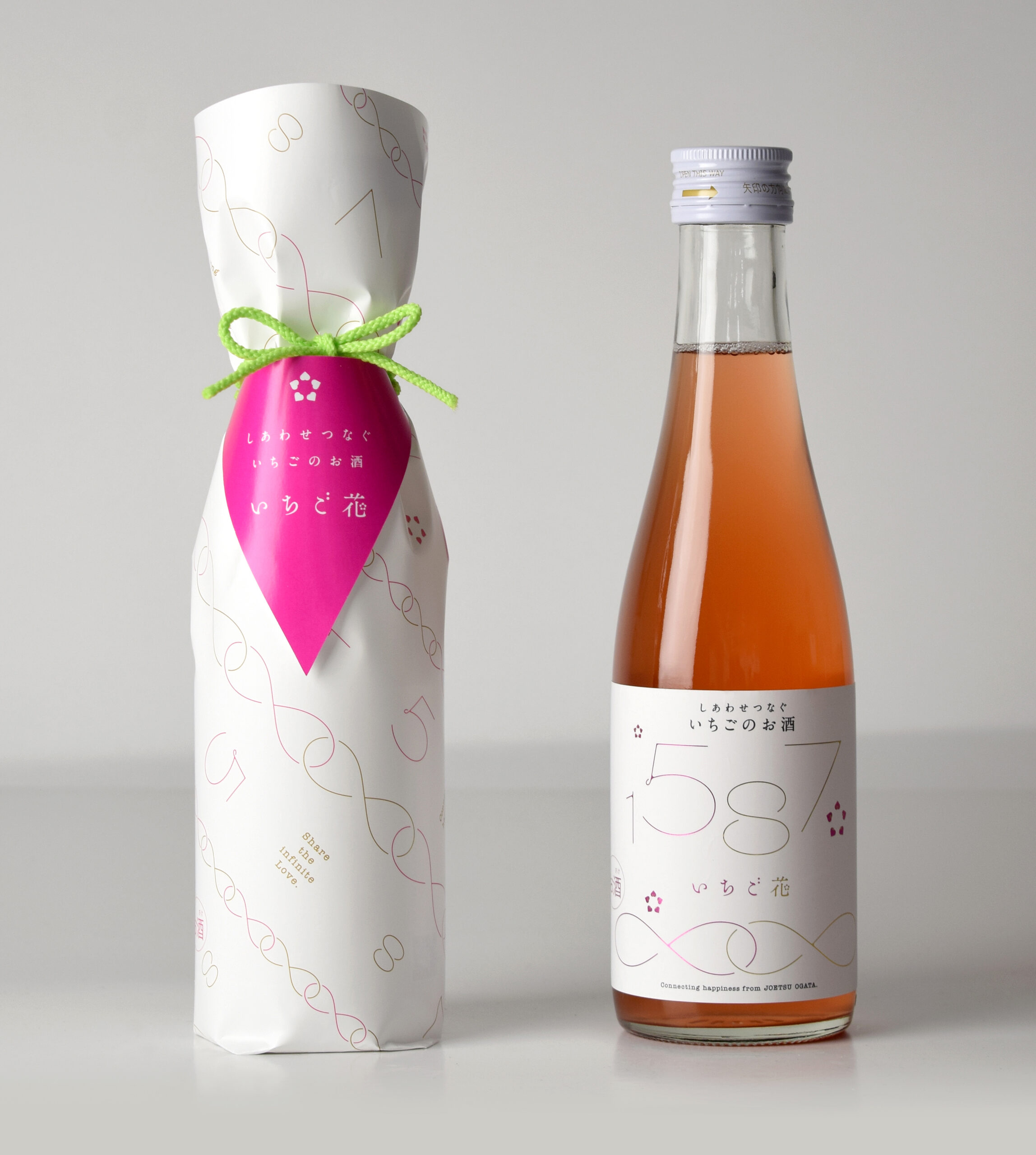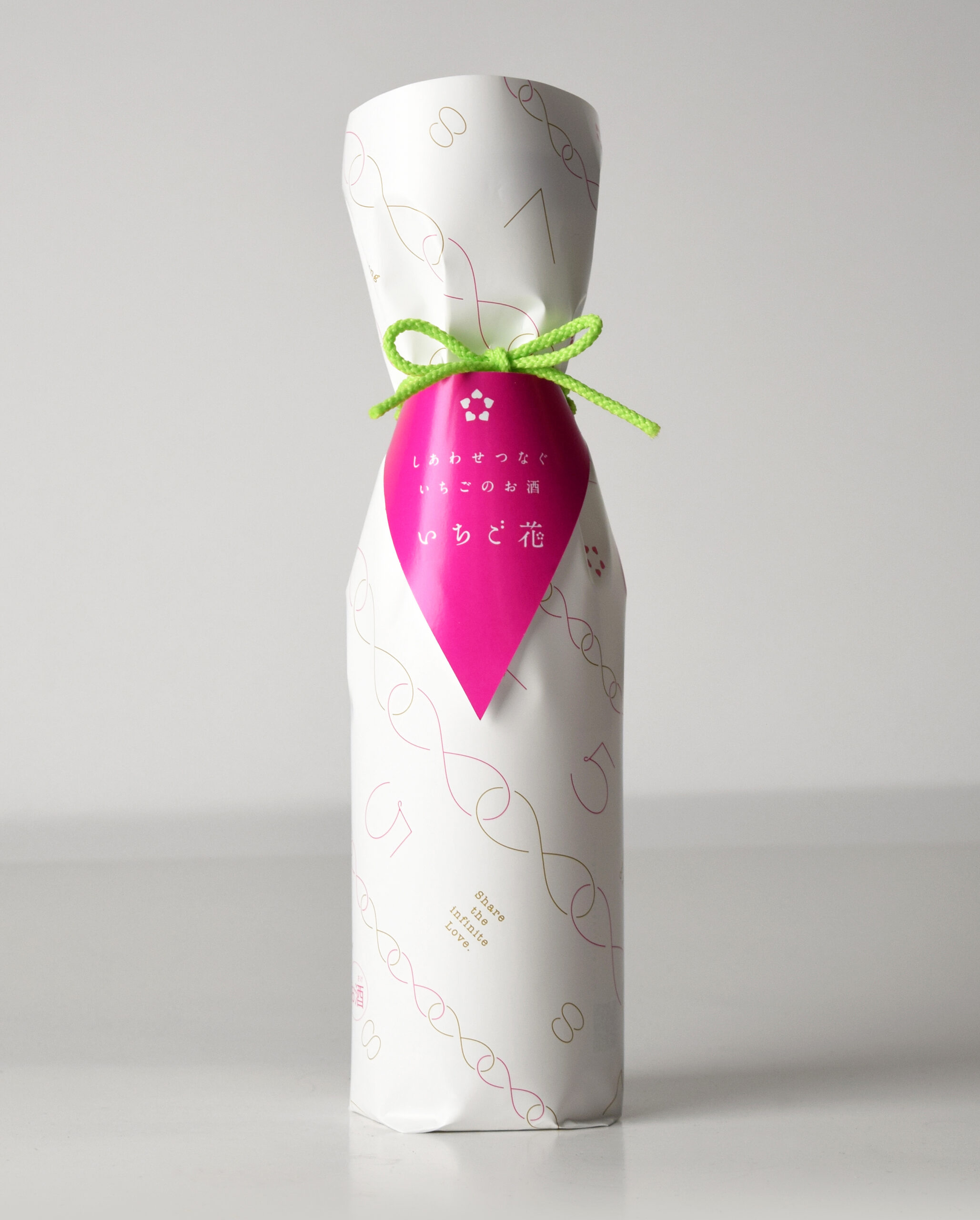 イチゴの花ことばは、“幸福な家庭”です。この花ことばのように、「いちご花」には多くの人たちに幸せが届くようにと願いが込められています。パッケージにも無限のマークの模様がついており、「いつまでも幸せがつながっていく」イメージを表現しています。今年から、よりイチゴらしさを演出するために、イチゴのヘタをイメージしてキャップを爽やかなグリーンにチェンジしました。