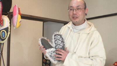 妙高市に住むアート作家・小鮒正博さんは3年前に群馬県から移住し、福祉の仕事をしながら布やビーズなどを使ったオリジナルの立体作品を手縫いで作っています。
