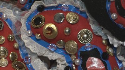 ボタンやレースを飾り付けて、地獄の中にあるひとつの希望を表現しています。