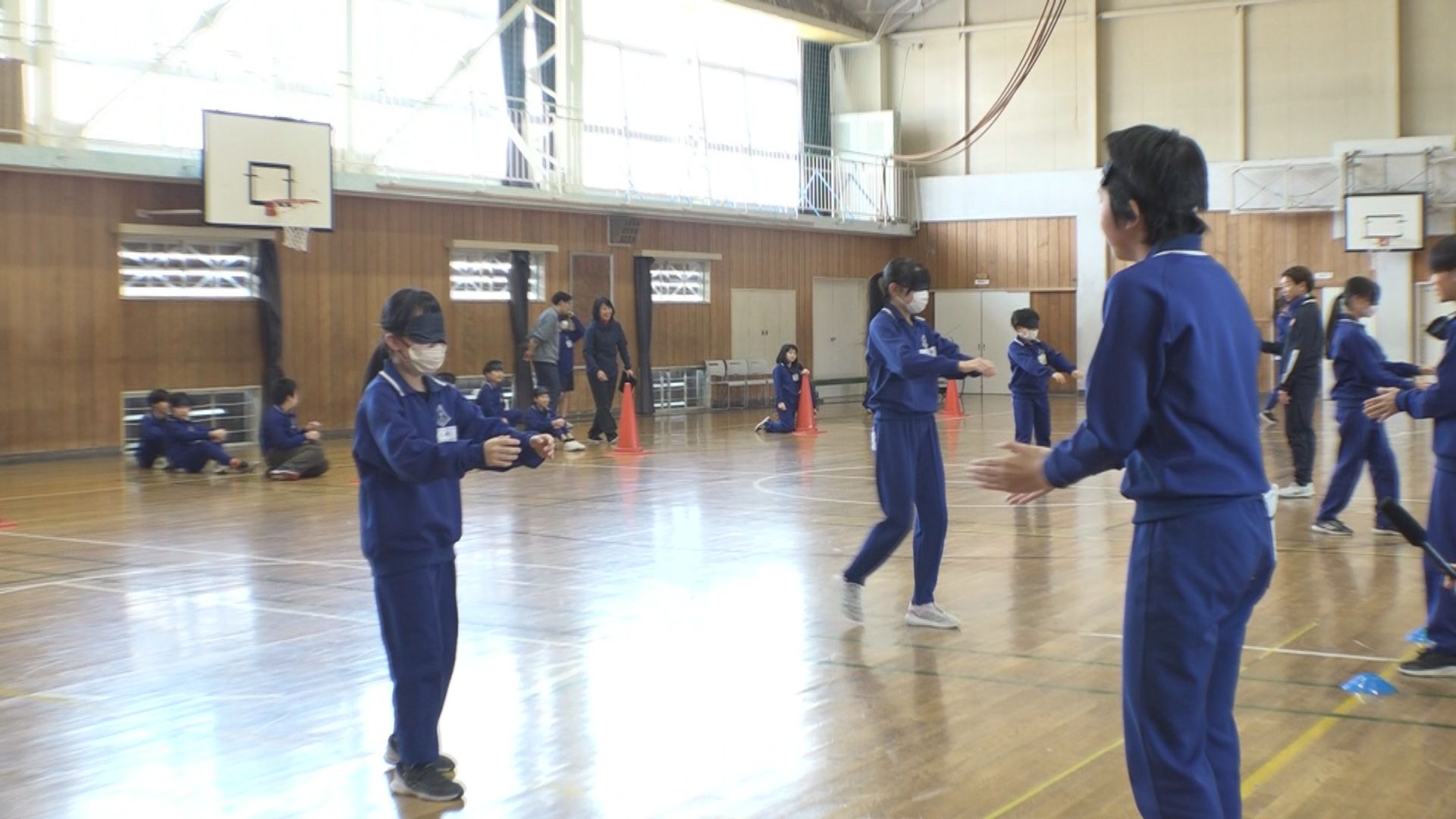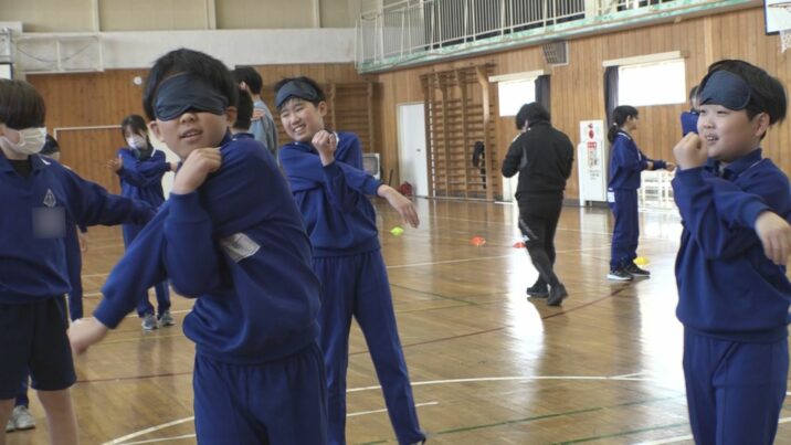 4年生から6年生の児童は、はじめにアイマスクをつけて視覚をさえぎった状態で体を動かしながら助け合うことの大切さを学びました。