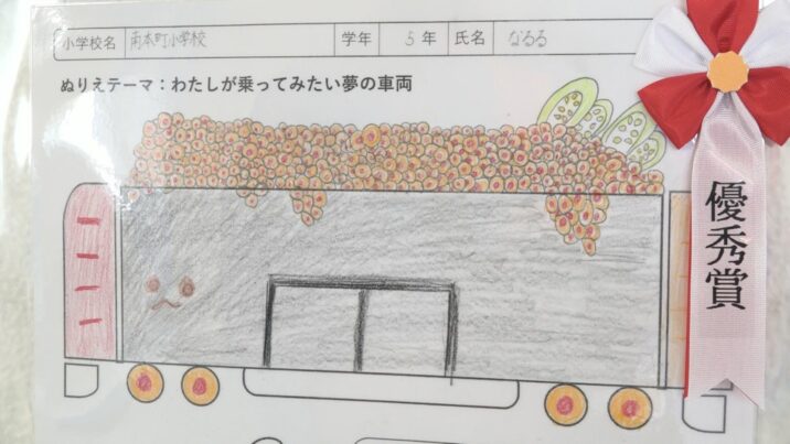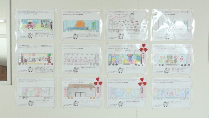 自由通路には、応募があった小学1年生から3年生までの低学年の部38点と、4年生から6年生までの高学年の部74点が展示されています。紙にはあらかじめ車両の枠だけ描かれていて、児童は自由に絵や色を書き足しました。