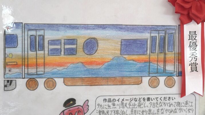 高学年の部の最優秀賞は直江津南小学校6年生 永井安吾さんの作品です。描いたのは沿線の魅力を詰め込んだ夜行列車です。夕方に糸魚川駅を出発し、夜に直江津駅で停泊。朝に妙高山を眺めながら妙高高原駅に着くイメージをしました。