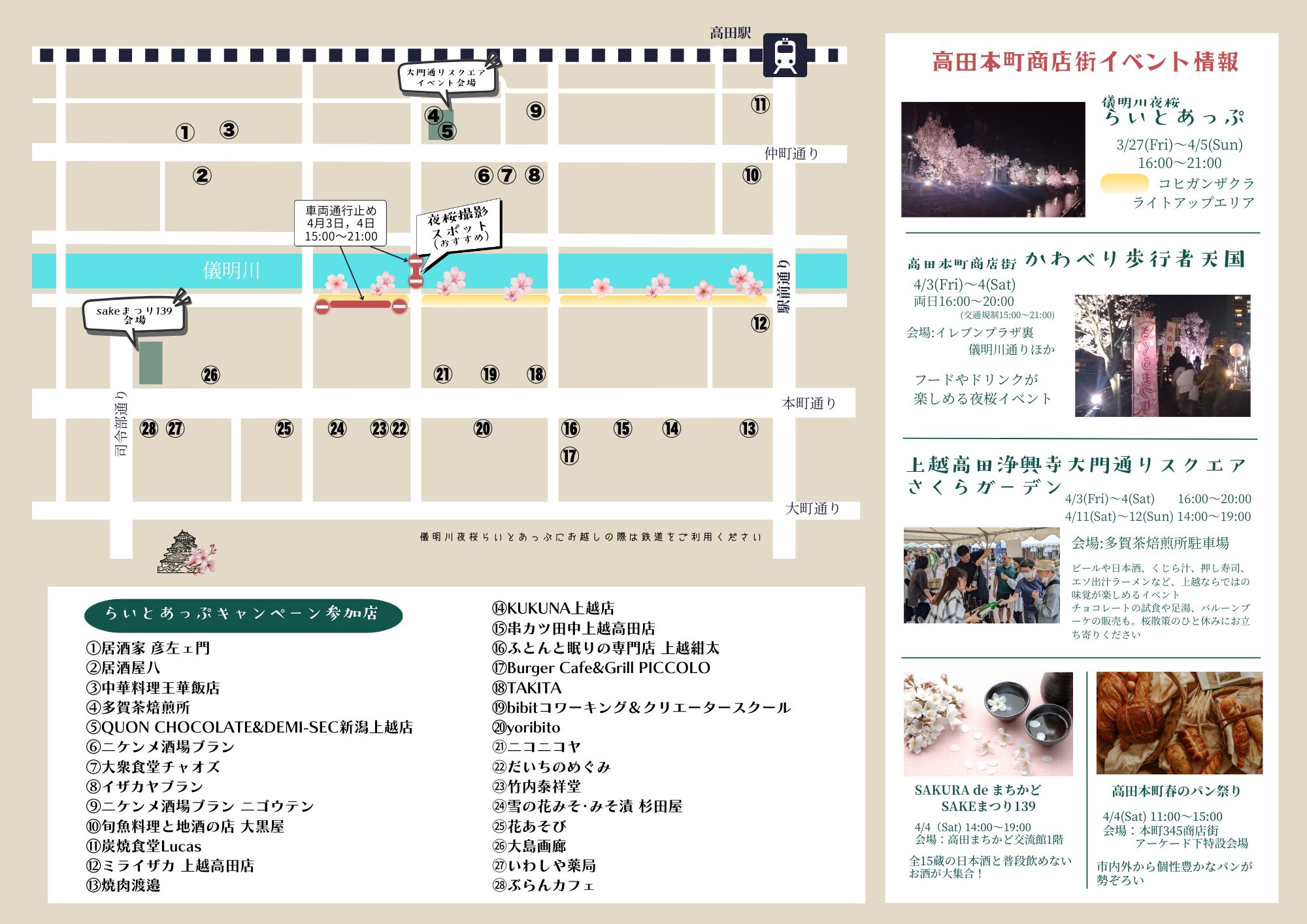 さらに仲町3丁目の多賀茶焙煎所駐車場では、夜桜を楽しみながらビールや日本酒、くじら汁、エソ出汁ラーメンなど、上越ならではの味覚が楽しめる「上越高田浄興寺大門通りスクエア さくらガーデン」が開催されます。
