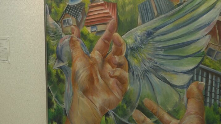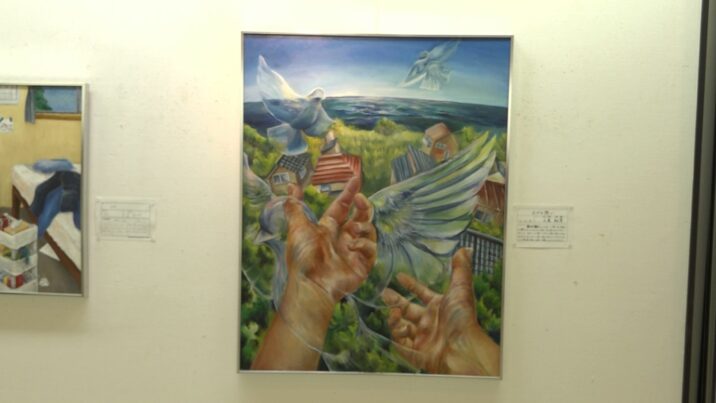 これは、2年生の石黒結芽さんの油絵「広げる想い」です。