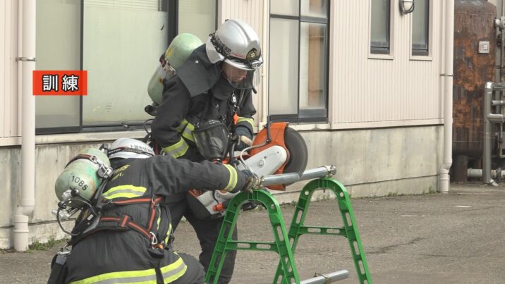 訓練に参加したのは頸北消防署の隊員14人です。「鵜の浜人魚館」の1階から火が出て火災により入口が歪んで開かない想定です。隊員はエンジンカッターで障害物を切り裂き建物の中に入って逃げ遅れた人を救助します。このほか、消防車を使った消火訓練も行われました。