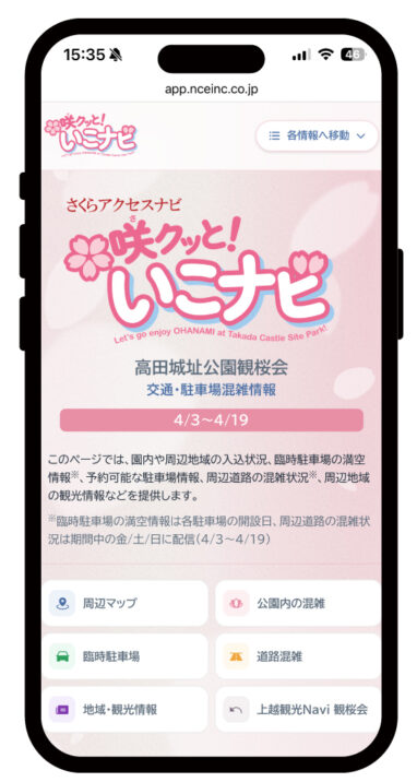 今年も4月3日(金)から上越の一大イベント「第101回 高田城址公園観桜会」がスタートしました。毎年、訪れた人たちの頭を悩ませる会場周辺の渋滞を回避しようと、交通アクセス情報サイト「咲クッと!いこナビ」が今年初めてオープンしました。