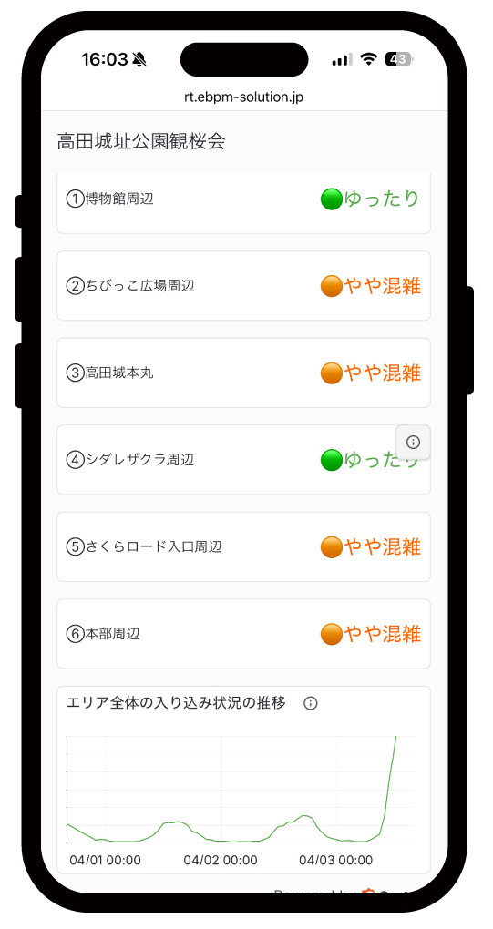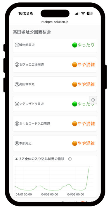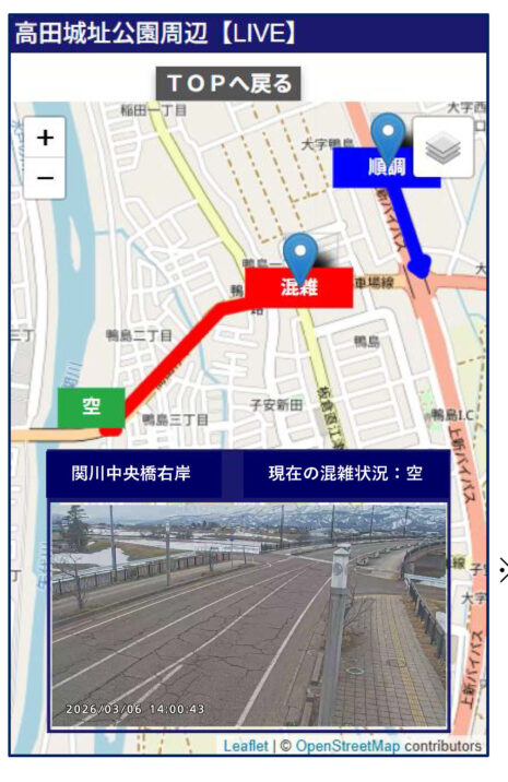 公園内の混雑では、博物館、ちびっこ広場周辺、高田城本丸、シダレザクラ周辺、さくらロード入口周辺、本部周辺の観桜会会場内の主な6か所の混雑状況をリアルタイムで表示します。