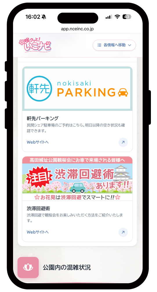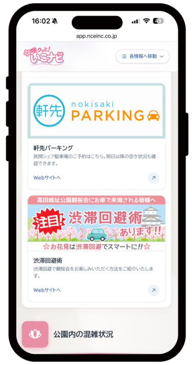 また、こちらのサイトから民間シェア駐車場の予約ができる「軒先パーキング」にも直接アクセスできます。スムーズに駐車ができるよう、こちらからあらかじめ駐車場の予約をしておくこともおすすめします。「咲クッと!いこナビ」を利用して、渋滞を回避してストレスなく高田城址公園観桜会を楽しんでください。